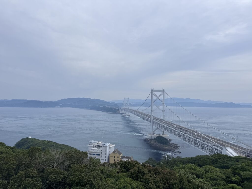 続いて車で5分ほど走って「大鳴門橋遊歩道 渦の道」に行きました。鳴門門橋の上から渦潮が見れるということで行きましたが、残念ながら天気が悪く、綺麗な渦を見ることができませんでした。歩いている橋の真下が海なので怖かったですね。。。